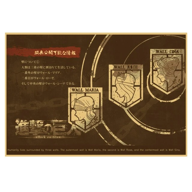 POSTER ATTAQUE DES TITANS TITAN : Dans chaque Ă©pisode, de courts intervalles explicatives interviennent pour nous donner des dĂ©tails sur le fonctionnement du monde dans lequel vie Eren. Voici un poster au sujets de Murs entourant l’humanitĂ©