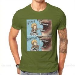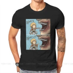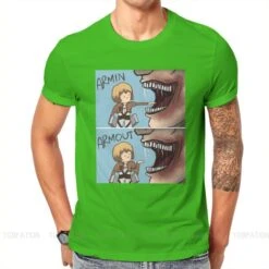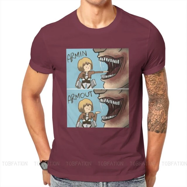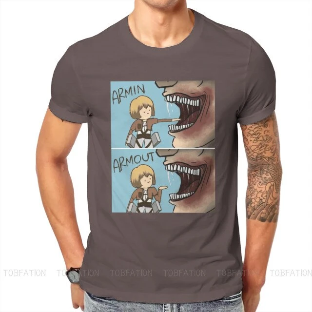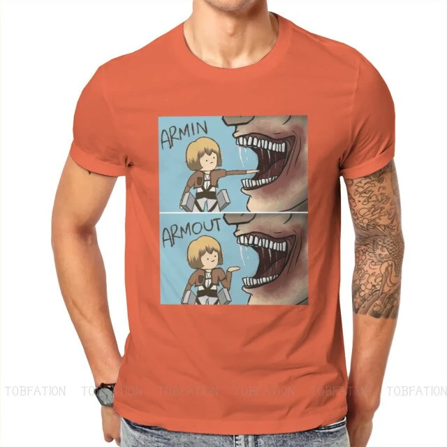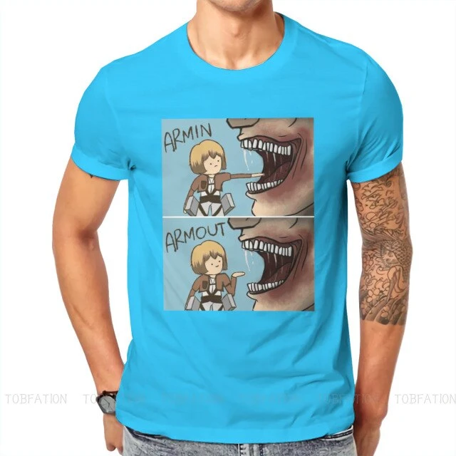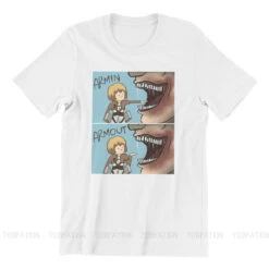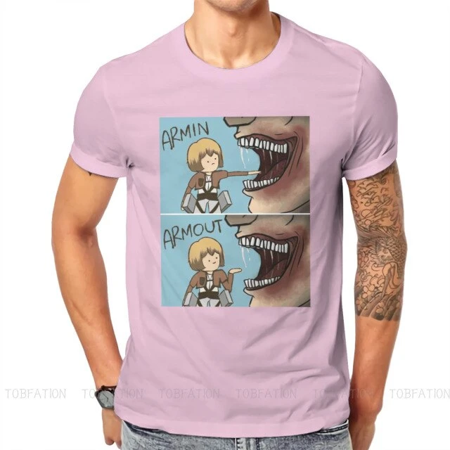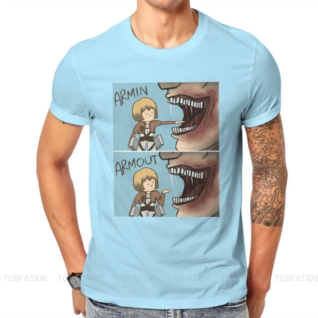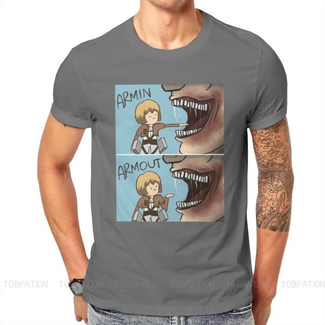 T-shirt SNK : Lors de l’invasion de Titans dans la saison 1, Armin a failli se faire dĂ©guster par un Titan, et a Ă©tĂ© sauvĂ© de justesse par Eren, perdant sa jambe lors du sauvetage