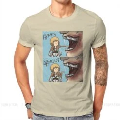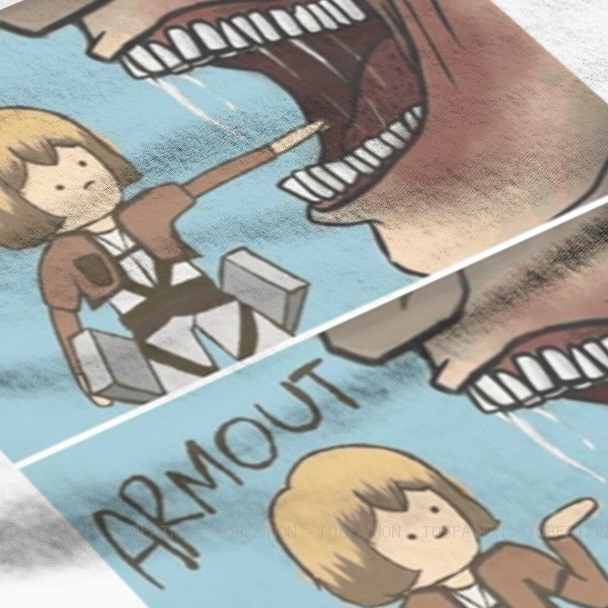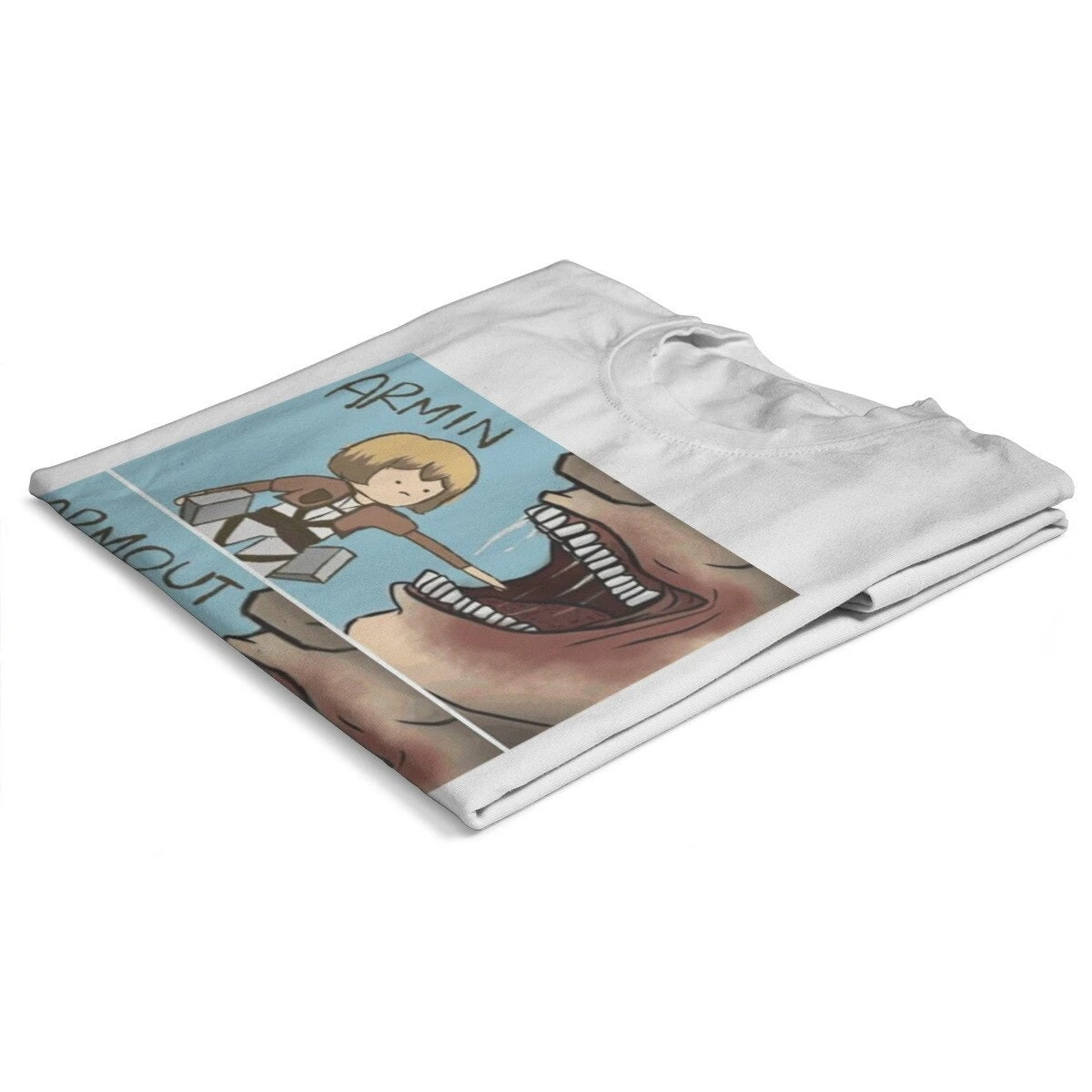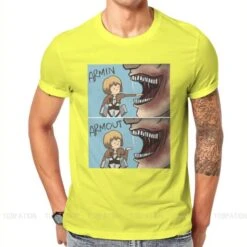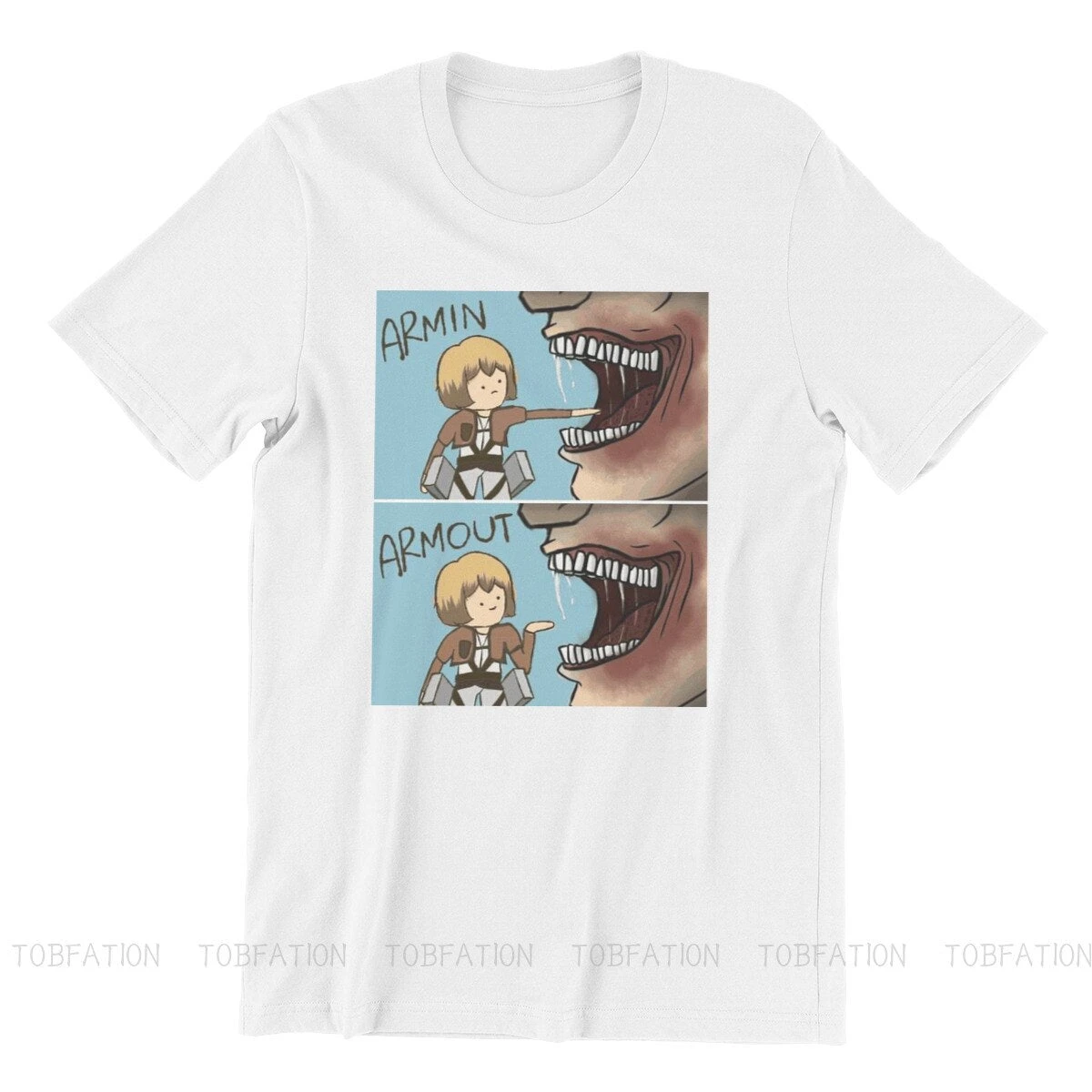 T-shirt SNK : Lors de l’invasion de Titans dans la saison 1, Armin a failli se faire dĂ©guster par un Titan, et a Ă©tĂ© sauvĂ© de justesse par Eren, perdant sa jambe lors du sauvetage
