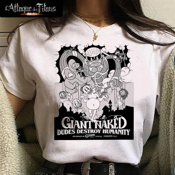 T-shirt Attaque des Titans : fais un clin d’oeil dĂ©calĂ© aux Titans avec ce t-shirt graphique les illustrant en style dessin-animĂ© vintage