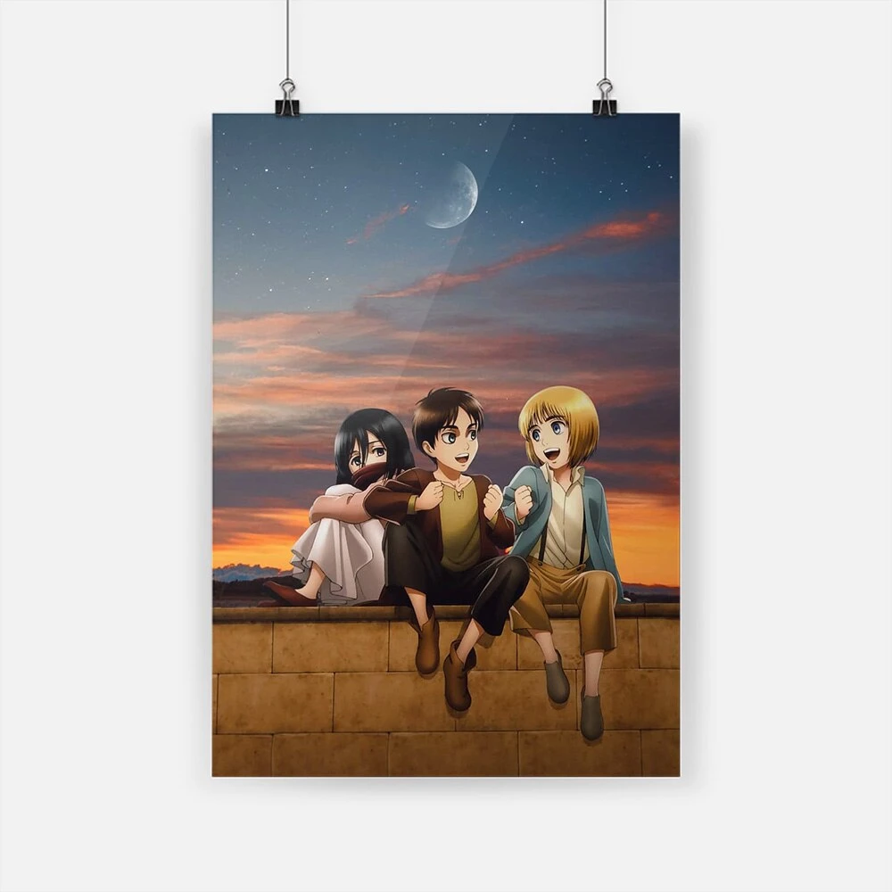 TABLEAU ATTAQUE DES TITANS : Mikasa, Eren et Armin sont assis sur un mur et passent un bon moment à la tombée de la nuit !