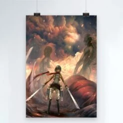 TABLEAU ATTAQUE DES TITANS : Lorsqu’on s’aventure hors des Murs, on est jamais sĂ»rs de ce qui s’y passera… Retrouve Mikasa, au milieu d’une attaque de Titans sur cette toile !
