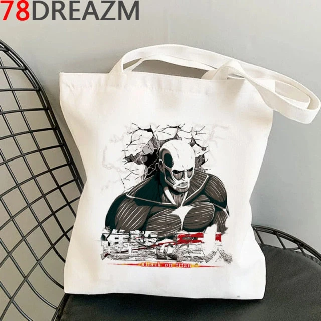 Tote bag Attaque des Titans : TransformĂ© en Titan CuirassĂ©, Reiner conduit Bertolt vers la porte extĂ©rieure du Mur Maria. Sous la forme du Titan Colossal, Bertolt apparaĂ®t au-delĂ de la porte sud du district de Shiganshina, brisant la porte et ouvrant une brèche dans le Mur Maria d’un seul coup de pied.